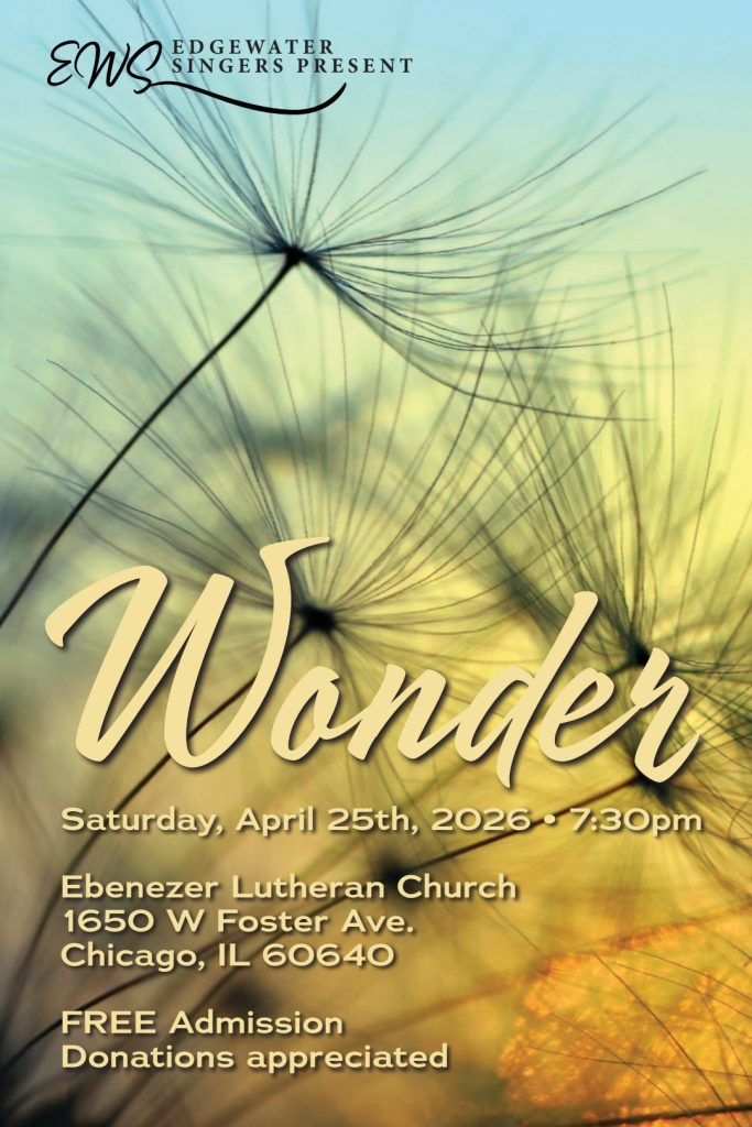 Please mark your calendars for April 25, 2026, at 7:30pm for our Spring concert: Wonder at Ebenezer Lutheran Church, 1650 W Foster Ave, Chicago, IL 60640.
